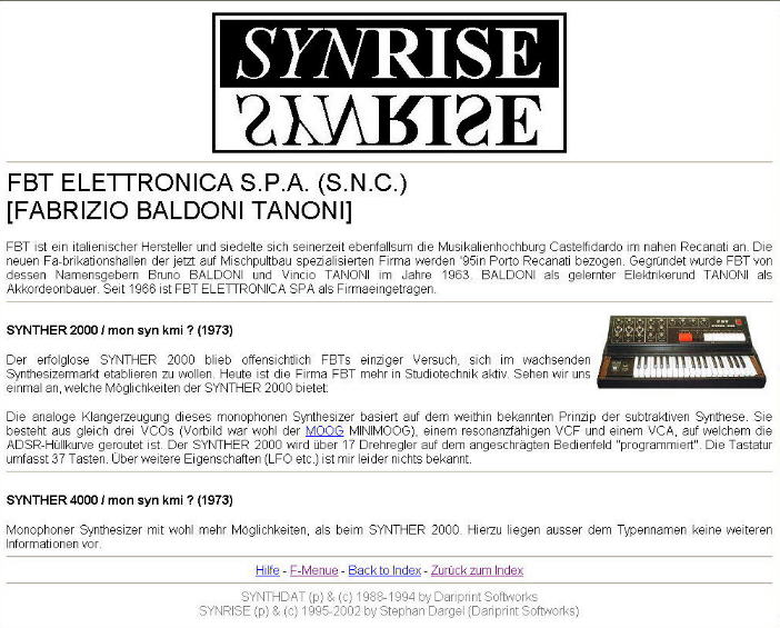 Und suchen wir uns dort nun noch eine Firma aus - hier zum Beispiel FBT - dann erscheinen die Infos zu den Gerätschaften der Firma bzw. nur zur Firma. Ggfs. findet sich eine weitere Übersicht, wenn die Firma sehr viele Produkte hergestellt hat.