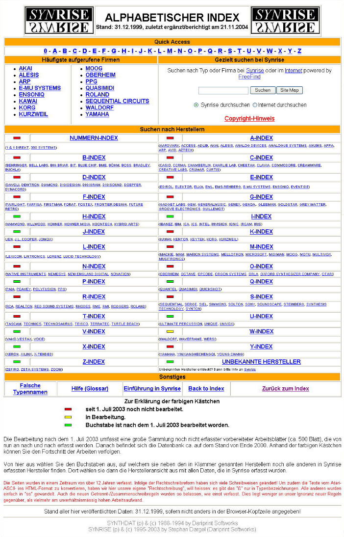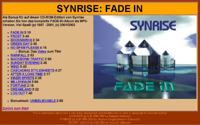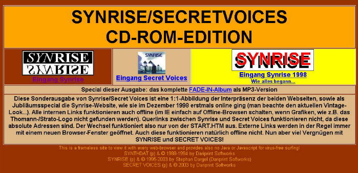 Kurzum: es gibt eine Menge zu lesen. Bilder sind eher die Ausnahme. Die CD-R enthält einen Spiegel der damaligen Website, d.h., dass externe Links auch ins Internet führen. Auch ist der Datenbestand unverändert, d.h., es gibt kaum mehr Aktualisierungen. Seiten haben teilweise keine Gültigkeit mehr (den AME e.V. gibt es offenbar nicht mehr). Vielleicht wird es mal eine professionelle Version von Synrise geben - hier und heute gibt es nicht mehr - aber auch nicht weniger!!