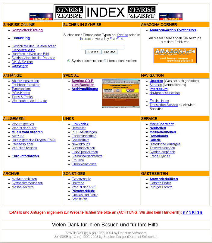 Wie Sie oben sehen, unterteilt sich Synrise in insgesamt vier Teile. Der eher nur noch historisch interessante Teil ist Synrise, wie es 1998 erstmals online ging:
